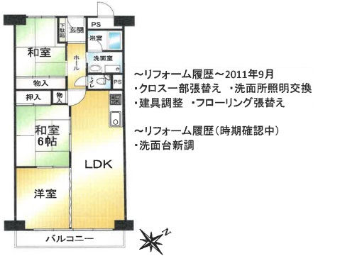 | 備考 | 売主契約不適合責任免責 ペット不可 居住しない場合は運営協力費500円/月要 駐車場要確認 ◆リフォーム履歴(2011年9月頃) ・クロス一部張替え・建具調整・洗面所照明交換・CF張替え・ 床フローリング張替え・その他・・ ◆リフォーム履歴(リフォーム時期確認中) ・洗面台交換 |