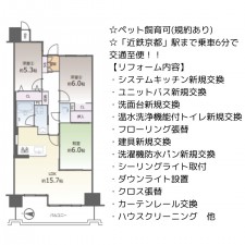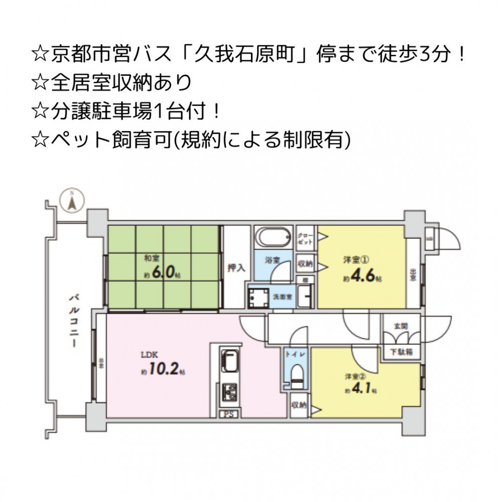 セールスポイント | ☆京都市営バス「久我石原町」停まで徒歩3分! ☆全居室収納あり ☆分譲駐車場1台付! ☆ペット飼育可(規約による制限有) |