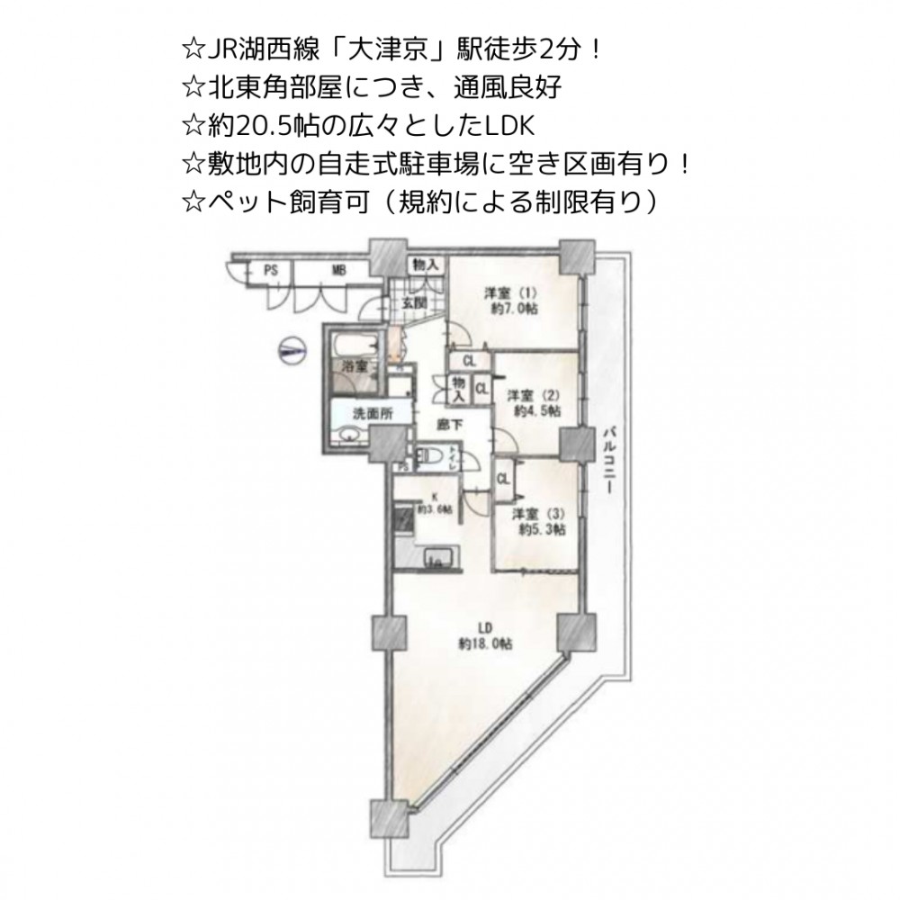 | セールスポイント | ☆JR湖西線「大津京」駅徒歩2分! ☆北東角部屋につき、通風良好 ☆約20.5帖の広々としたLDK ☆敷地内の自走式駐車場に空き区画有り! ☆ペット飼育可(規約による制限有り) 【2025年5月リフォーム完了】 ・全室クロス、フローリング張替 ・間取り変更(和室→洋室) ・キッチン、洗面化粧台、ユニットバス、トイレ、建具交換 |