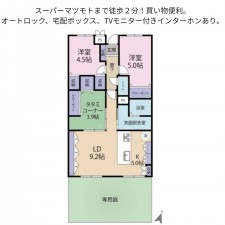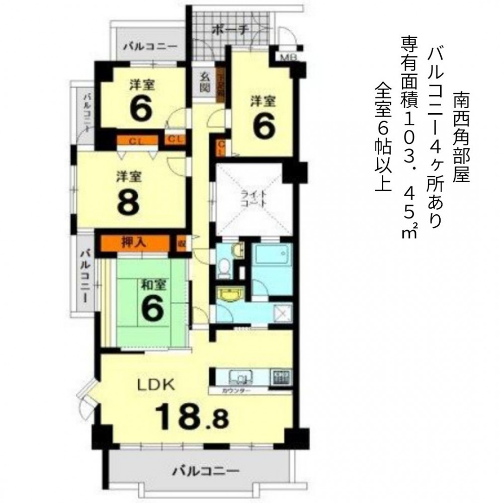 | セールスポイント | 南西角部屋 バルコニー4ヶ所あり 専有面積103.45㎡ 全室6帖以上 |