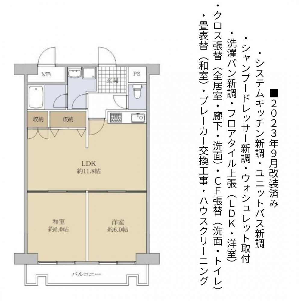 セールスポイント | ■2023年9月改装済み!! ・システムキッチン新調 ・ユニットバス新調 ・シャンプードレッサー新調 ・ウォシュレット取付 ・洗濯パン新調 ・フロアタイル上張(LDK・洋室) ・クロス張替(全居室・廊下・洗面) ・CF張替(洗面・トイレ) ・畳表替(和室) ・ブレーカー交換工事 ・ハウスクリーニング |