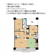 セールスポイント | ☆南向きバルコニーで陽当たり良好♪ ☆最上階のお部屋! ☆オートロックマンション ☆石山寺や瀬田川が近く風情のある環境 ☆小中学校まで徒歩10分圏内でお子様の通学も安心 【2025年10月リフォーム済み】 ・浴室交換 ・クロス、襖貼替 ・ハウスクリーニング |