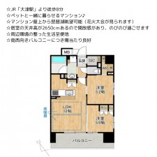 セールスポイント | ☆JR「大津駅」より徒歩8分 ☆京阪「島ノ関駅」より徒歩5分 ☆ペットと一緒に暮らせるマンション♪ ☆マンション屋上から琵琶湖眺望可能(花火大会が見られます) ☆居室の天井高が2650cmあるので開放感があり、のびのび過ごせます ☆周辺環境の整った生活至便地 ☆南西向きバルコニーにつき陽当たり良好 |