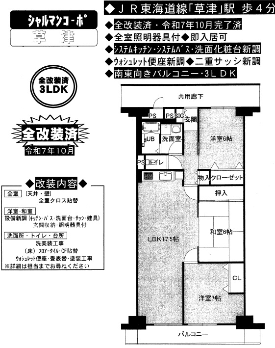 | 備考 | ※駐車場空き状況確認 7,000~8,000円(月額) 自治会費:2400円(年額) その他200円(月額) インターネット(ケイオプティコム・ヤフーBB NTT KDDI)選択 全改装済【令和7年10月】改装内容 全室:(天井壁)全室クロス貼替 洋室・和室:設備新調 (キッチン・バス・洗面台・サッシ・建具) 玄関収納・照明器具付 洗面所・トイレ・台所:洗美装工事・(床) フロアータイル・CF貼替 ・ウォシュレット便座 畳表替・塗装 |