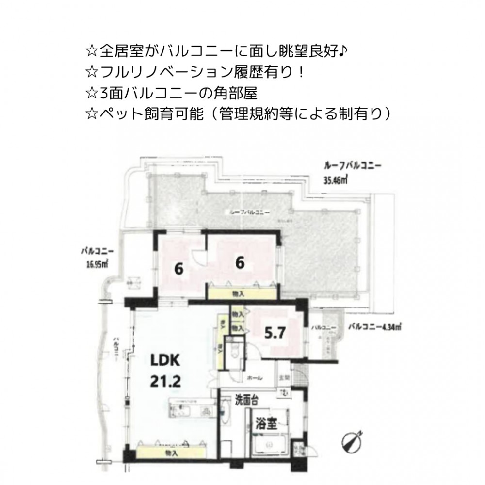 | セールスポイント | ☆全居室がバルコニーに面し眺望良好♪ ☆フルリノベーション履歴有り! ☆3面バルコニーの角部屋 ☆ペット飼育可能(管理規約等による制有り) |