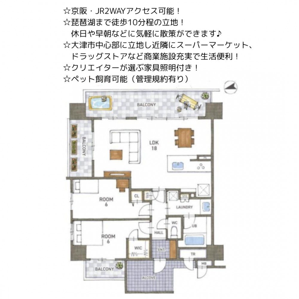 | セールスポイント | ☆京阪・JR2WAYアクセス可能! ☆琵琶湖まで徒歩10分程の立地!休日や早朝などに気軽に散策ができます♪ ☆LDK広々18帖 ☆大津市中心部に立地し近隣にスーパーマーケット、ドラッグストアなど商業施設充実で生活便利! ☆クリエイターが選ぶ家具照明付き! ☆ペット飼育可能(管理規約有り) |