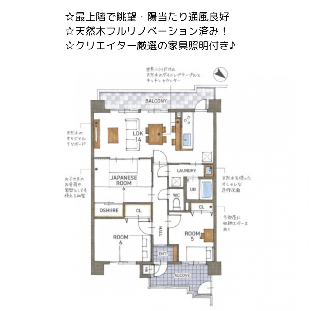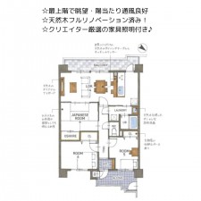 | セールスポイント | ☆最上階で眺望・陽当たり通風良好 ☆天然木フルリノベーション済み! ☆クリエイター厳選の家具照明付き♪ |