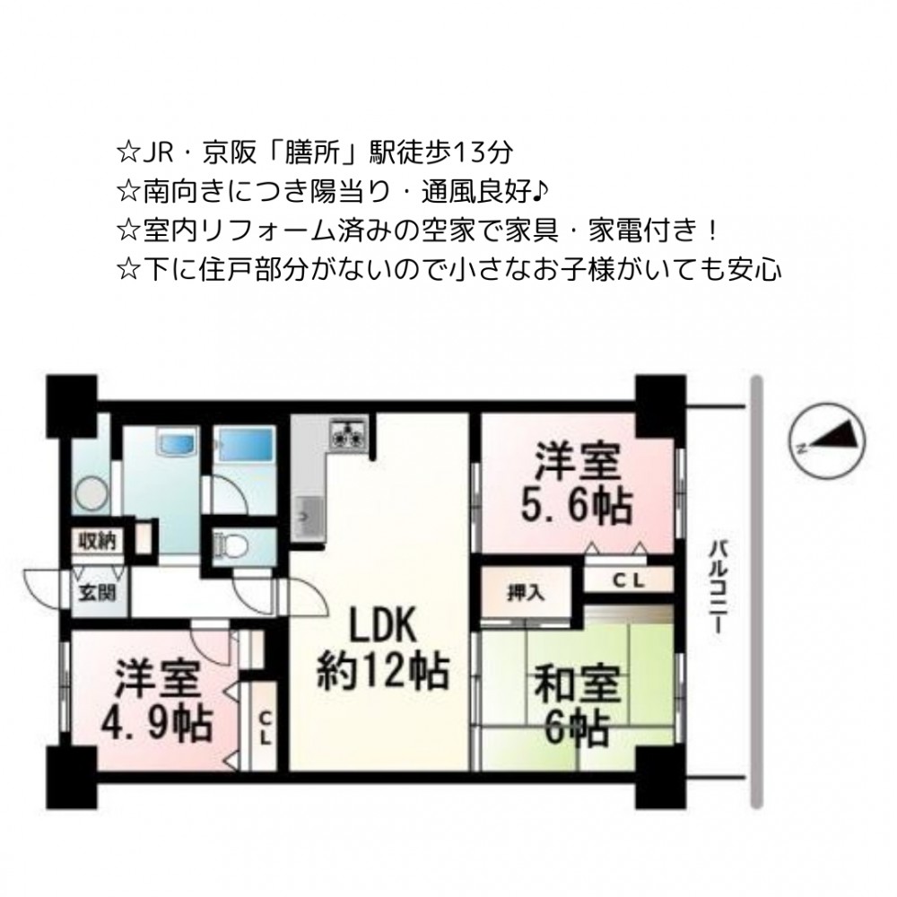 | セールスポイント | ☆JR・京阪「膳所」駅徒歩13分 ☆南向きにつき陽当り・通風良好♪ ☆室内リフォーム済みの空家で家具・家電付き! ☆下に住戸部分がないので小さなお子様がいても安心♪ |
