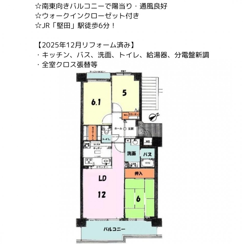 | セールスポイント | ☆南東向きバルコニーで陽当り・通風良好 ☆ウォークインクローゼット付き ☆JR「堅田」駅徒歩6分! 【2025年12月リフォーム済み】 ・キッチン、バス、洗面、トイレ、給湯器、分電盤新調 ・全室クロス張替等 |