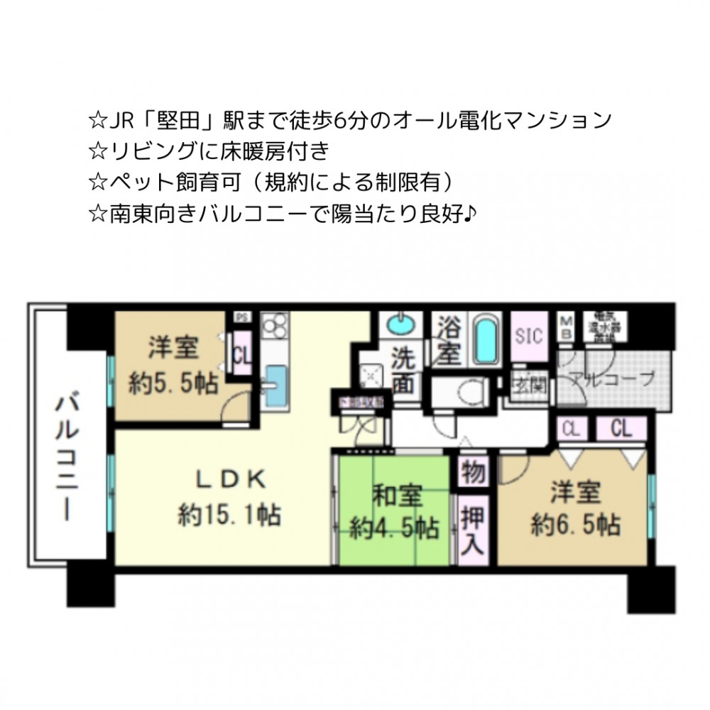 | セールスポイント | ☆JR「堅田」駅まで徒歩6分のオール電化マンション ☆リビングに床暖房付き ☆ペット飼育可(規約による制限有) ☆南東向きバルコニーで陽当たり良好♪ |