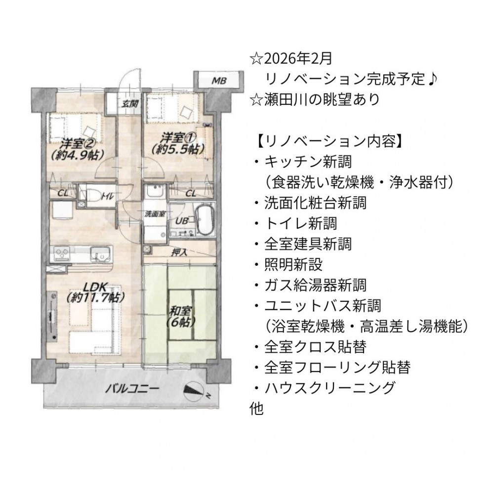 | セールスポイント | ☆2026年2月リノベーション完成予定♪ ☆瀬田川の眺望あり 【リノベーション内容】 ・キッチン新調(食器洗い乾燥機・浄水器付) ・洗面化粧台新調 ・トイレ新調 ・全室建具新調 ・照明新設 ・ガス給湯器新調 ・ユニットバス新調(浴室乾燥機・高温差し湯機能) ・全室クロス貼替 ・全室フローリング貼替 ・ハウスクリーニング 他 |