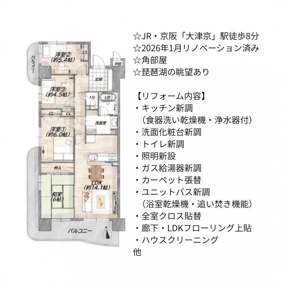 | セールスポイント | ☆JR・京阪「大津京」駅徒歩8分 ☆2026年1月リノベーション済み ☆角部屋 ☆琵琶湖の眺望あり ☆全居室収納有り、ファミリーにも嬉しい間取り♪ ☆駅・スーパー等徒歩圏内の便利な住環境! 【リフォーム内容】 ・キッチン新調(食器洗い乾燥機・浄水器付) ・洗面化粧台新調 ・トイレ新調 ・照明新設 ・ガス給湯器新調 ・カーペット張替 ・ユニットバス新調(浴室乾燥機・追い焚き機能) ・全室クロス貼替 ・廊下・LDKフローリング上貼 ・ハウスクリーニング 他 |