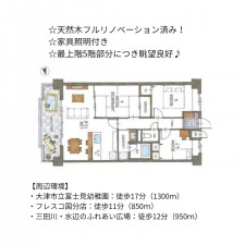 | 備考 | 【周辺環境】 ・大津市立富士見幼稚園:徒歩17分(1300m) ・フレスコ国分店:徒歩11分(850m) ・三田川・水辺のふれあい広場:徒歩12分(950m) |
