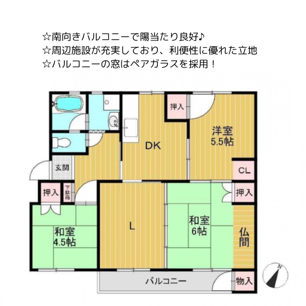| セールスポイント | ☆南向きバルコニーで陽当たり良好♪ ☆周辺施設が充実しており、利便性に優れた立地 ☆バルコニーの窓はペアガラスを採用! |