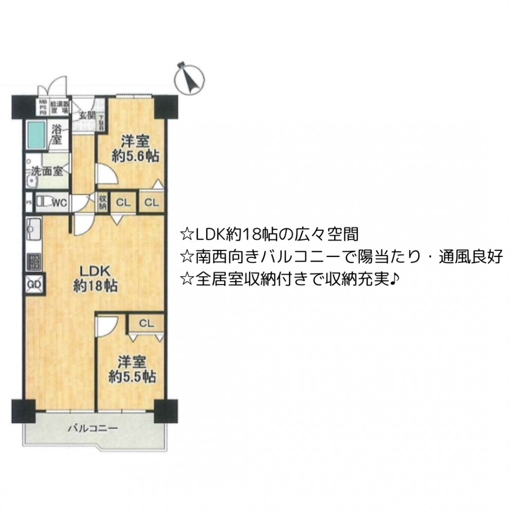 | セールスポイント | ☆LDK約18帖の広々空間 ☆南西向きバルコニーで陽当たり・通風良好 ☆全居室収納付きで収納充実♪ 【2026年2月リフォーム済み】 ・システムキッチン、ユニットバス、洗面化粧台、トイレ、建具新調 ・全室フローリング、全室クロス、CF貼替 |