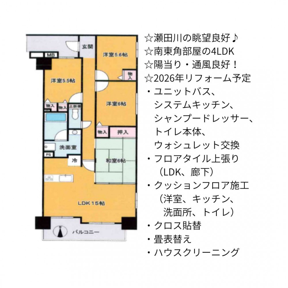 | セールスポイント | ☆瀬田川の眺望良好♪ ☆南東角部屋の4LDK ☆陽当り・通風良好! ☆2026年リフォーム予定 ・ユニットバス、システムキッチン、シャンプードレッサー、トイレ本体、ウォシュレット交換 ・フロアタイル上張り(LDK、廊下) ・クッションフロア施工(洋室、キッチン、洗面所、トイレ) ・クロス貼替 ・畳表替え ・ハウスクリーニング |