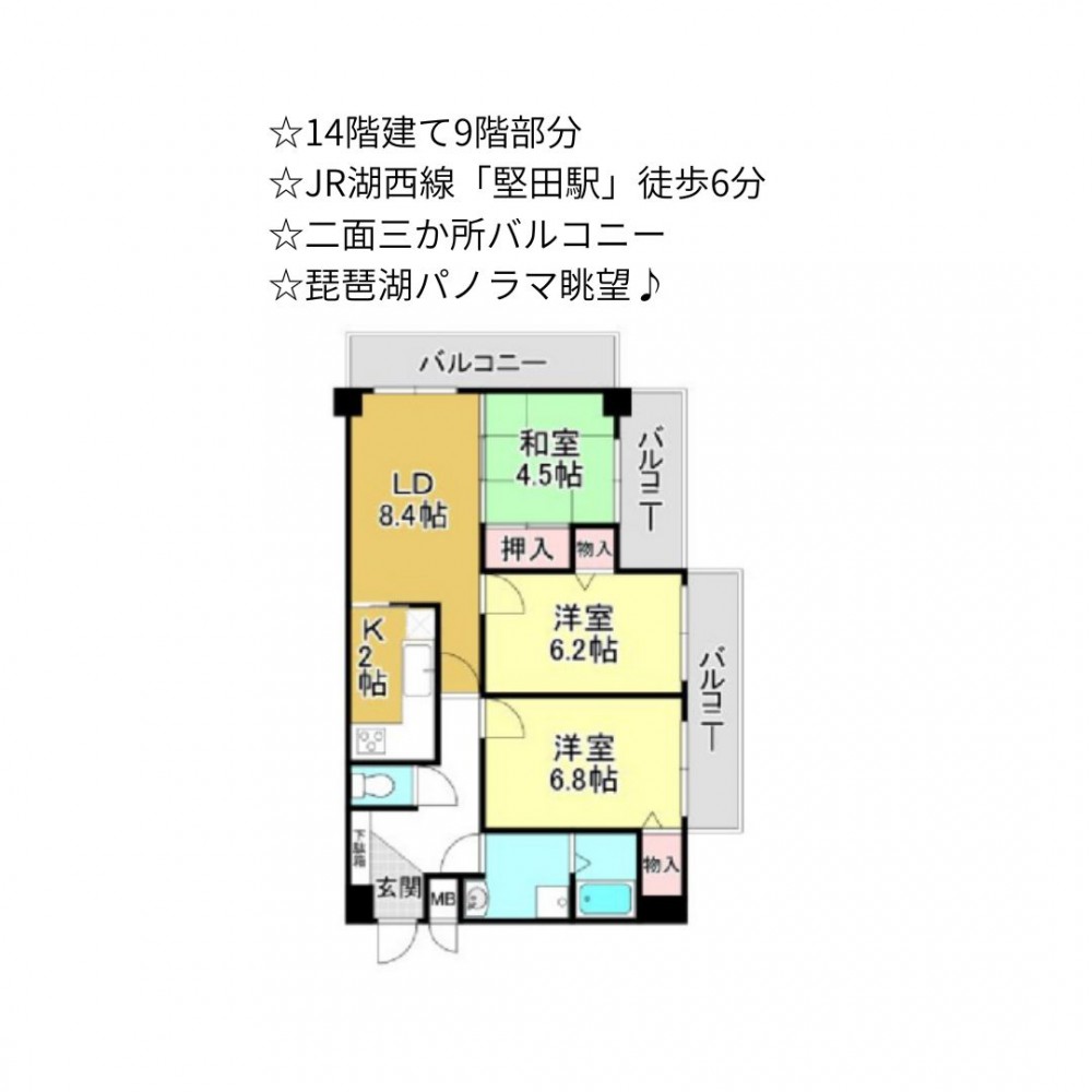 | セールスポイント | ☆14階建て9階部分 ☆JR湖西線「堅田駅」徒歩6分 ☆二面三か所バルコニー ☆琵琶湖パノラマ眺望♪ |