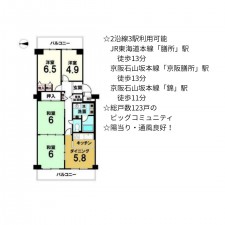 | セールスポイント | ☆2沿線3駅利用可能 JR東海道本線「膳所」駅 徒歩13分 京阪石山坂本線「京阪膳所」駅 徒歩13分 京阪石山坂本線「錦」駅 徒歩11分 ☆総戸数123戸のビッグコミュニティ ☆陽当り・通風良好! |
