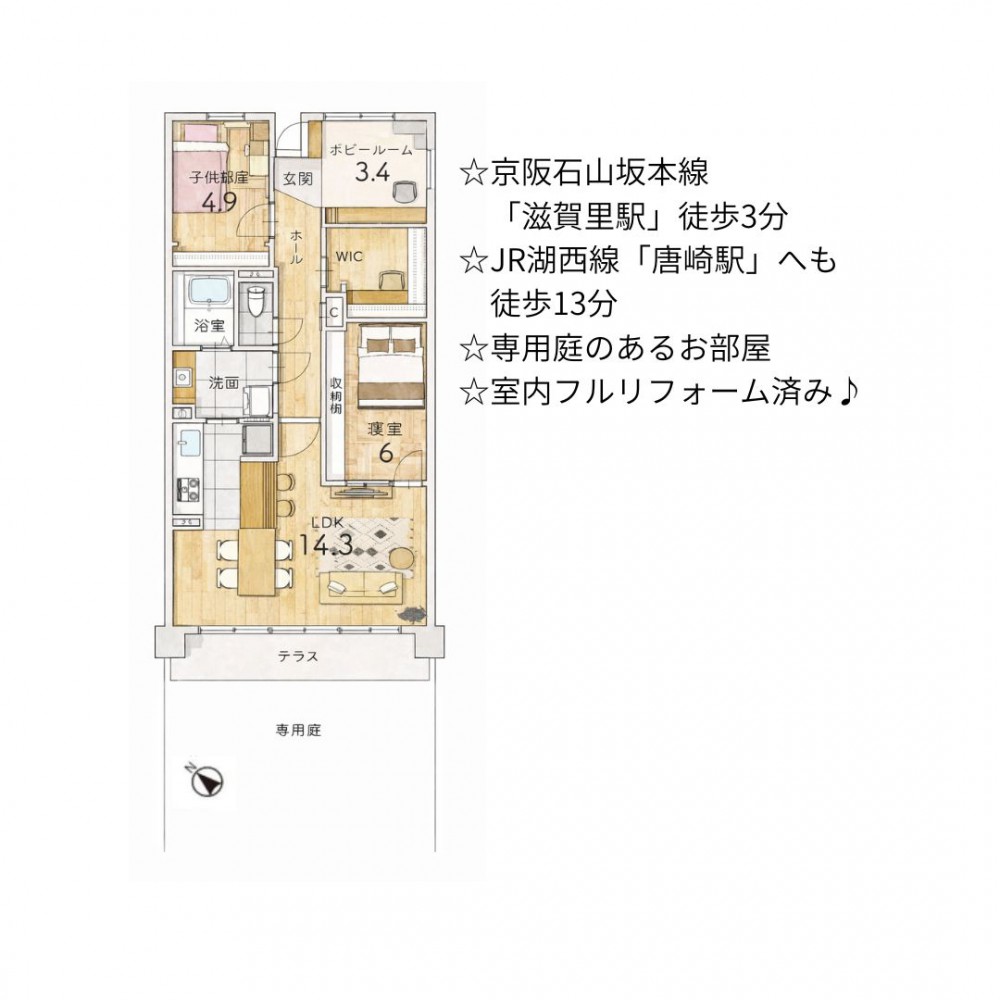 | セールスポイント | ☆京阪石山坂本線「滋賀里駅」徒歩3分 ☆JR湖西線「唐崎駅」へも徒歩13分 ☆専用庭のあるお部屋 ☆室内フルリフォーム済み♪ |