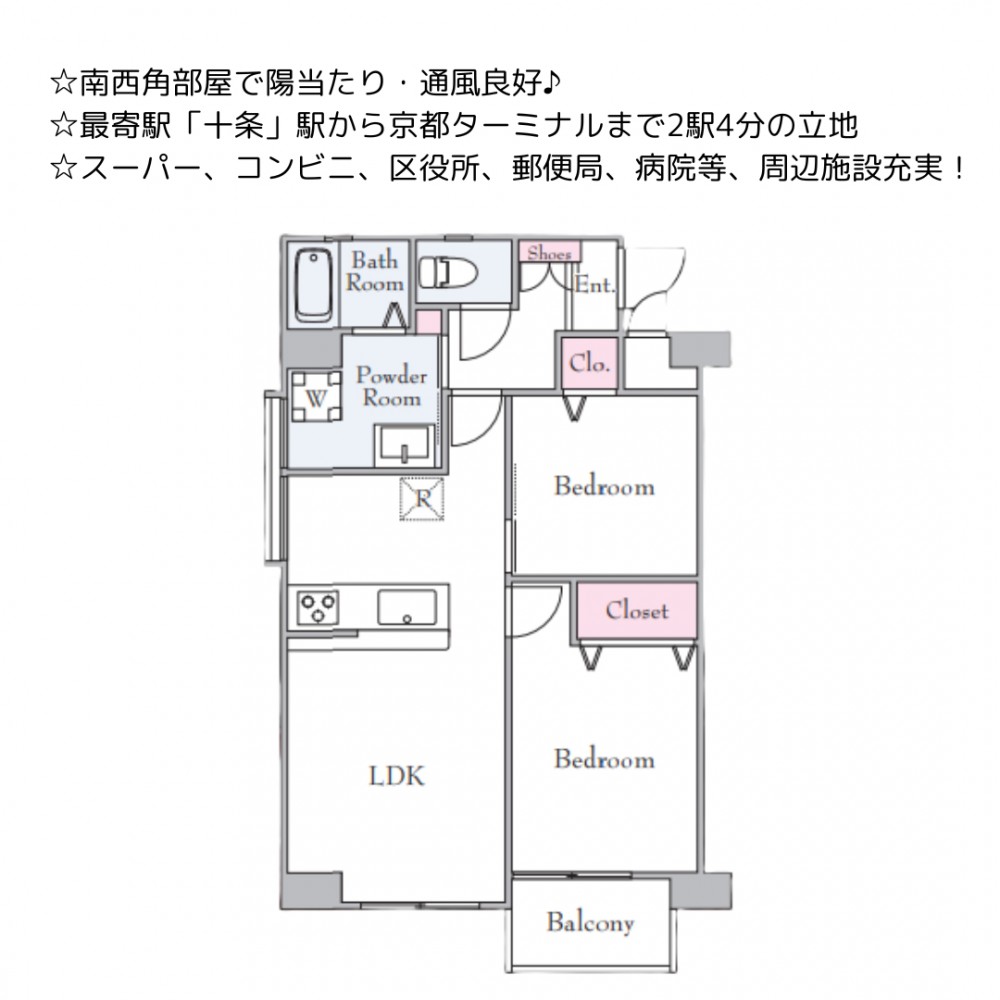 | 備考 | 【周辺環境】 ・パケット十条店 徒歩9分(約700m) ・イオン洛南ショッピングセンター 徒歩17分(約1,300m) ・ローソン 京都南区役所前店 徒歩2分(約140m) ・東寺南病院 徒歩2分(約140m) ・京都市南区役所 徒歩2分(約100m) ・京都東寺前郵便局 徒歩7分(約500m) ・京都市南保育所 徒歩5分(約350m) |