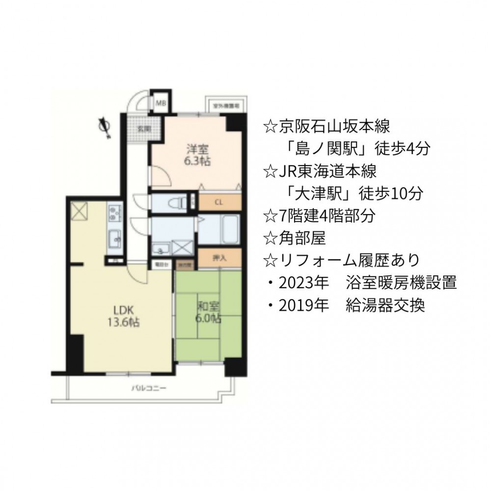 | セールスポイント | ☆京阪石山坂本線「島ノ関駅」徒歩4分 ☆JR東海道本線「大津駅」徒歩10分 ☆7階建4階部分 ☆角部屋 ☆リフォーム履歴あり ・2023年 浴室暖房機設置 ・2019年 給湯器交換 |
