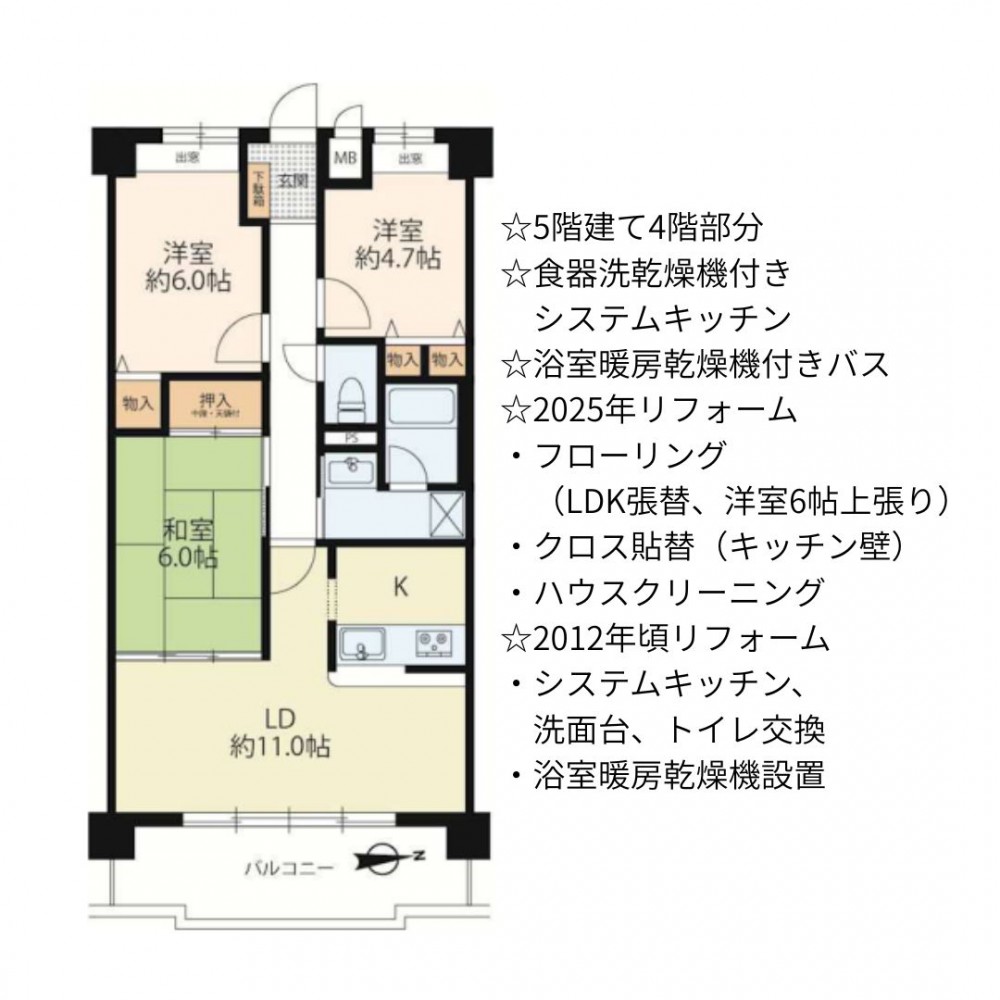| セールスポイント | ☆5階建て4階部分 ☆食器洗乾燥機付きシステムキッチン ☆浴室暖房乾燥機付きバス ☆2025年リフォーム ・フローリング(LDK張替、洋室6帖上張り) ・クロス貼替(キッチン壁) ・ハウスクリーニング ☆2012年頃リフォーム ・システムキッチン、洗面台、トイレ交換 ・浴室暖房乾燥機設置 |
