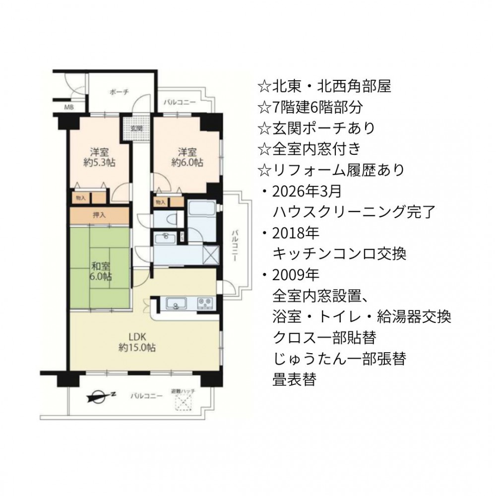 | セールスポイント | ☆北東・北西角部屋 ☆7階建6階部分 ☆玄関ポーチあり ☆全室内窓付き ☆リフォーム履歴あり ・2026年3月:ハウスクリーニング完了 ・2018年:キッチンコンロ交換 ・2009年:全室内窓設置、浴室・トイレ・給湯器交換 クロス一部貼替、じゅうたん一部張替、畳表替 |