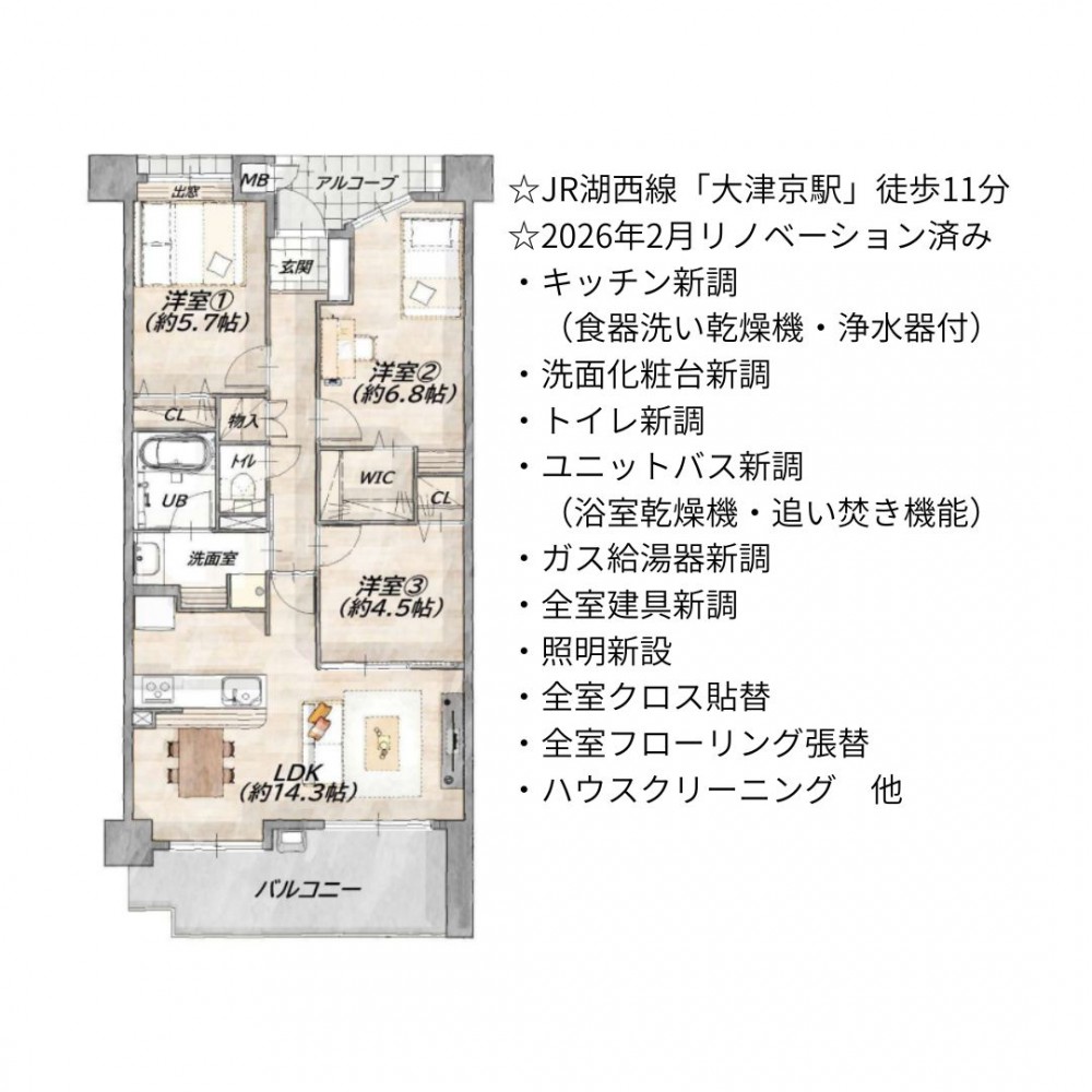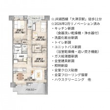 | セールスポイント | ☆JR湖西線「大津京駅」徒歩11分 ☆2026年2月リノベーション済み ・キッチン新調(食器洗い乾燥機・浄水器付) ・洗面化粧台新調 ・トイレ新調 ・ユニットバス新調(浴室乾燥機・追い焚き機能) ・ガス給湯器新調 ・全室建具新調 ・照明新設 ・全室クロス貼替 ・全室フローリング張替 ・ハウスクリーニング 他 |