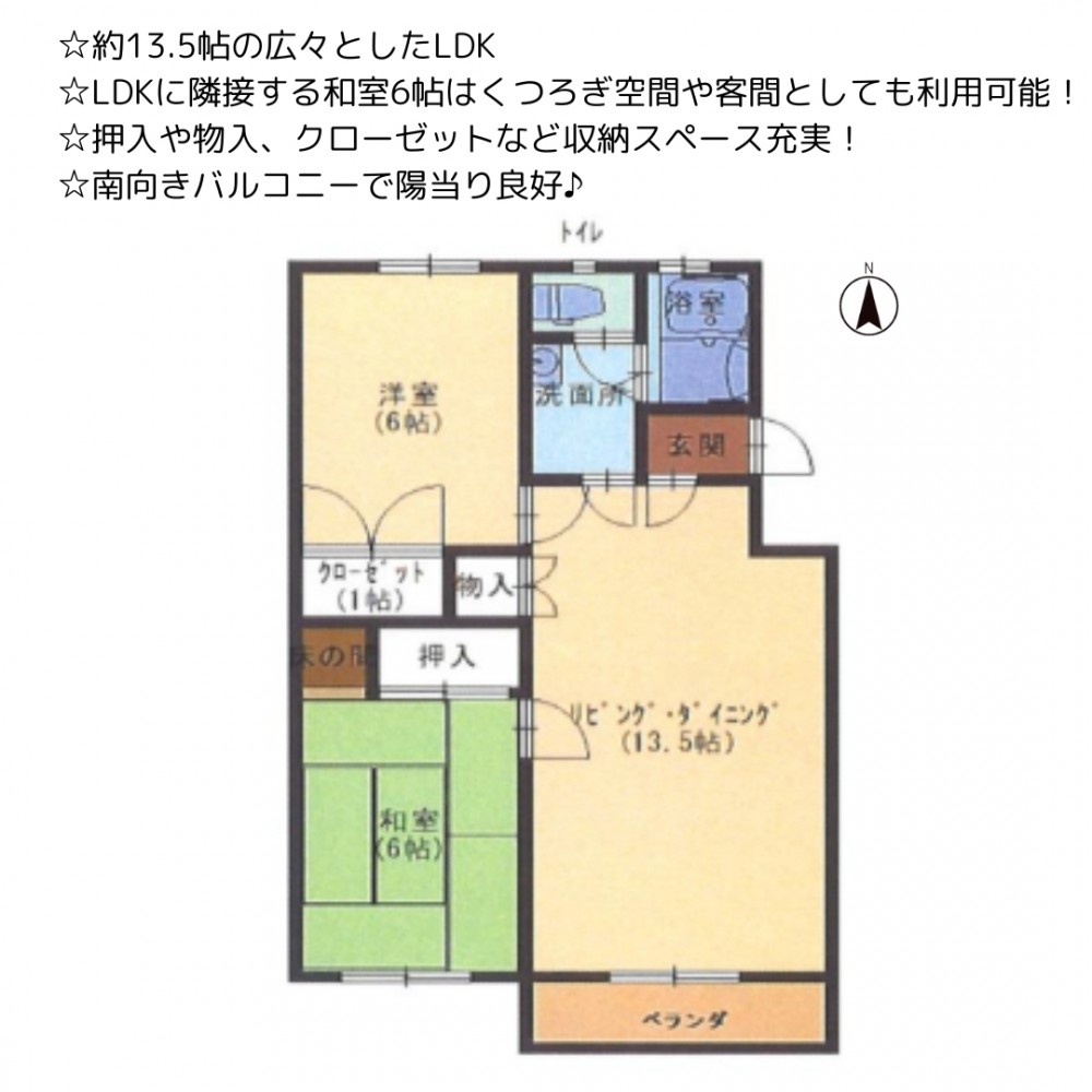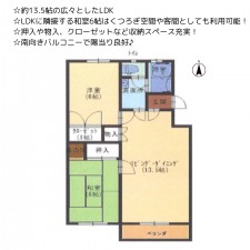 | セールスポイント | ☆約13.5帖の広々としたLDK ☆LDKに隣接する和室6帖はくつろぎ空間や客間としても利用可能! ☆押入や物入、クローゼットなど収納スペース充実! ☆南向きバルコニーで陽当り良好♪ |