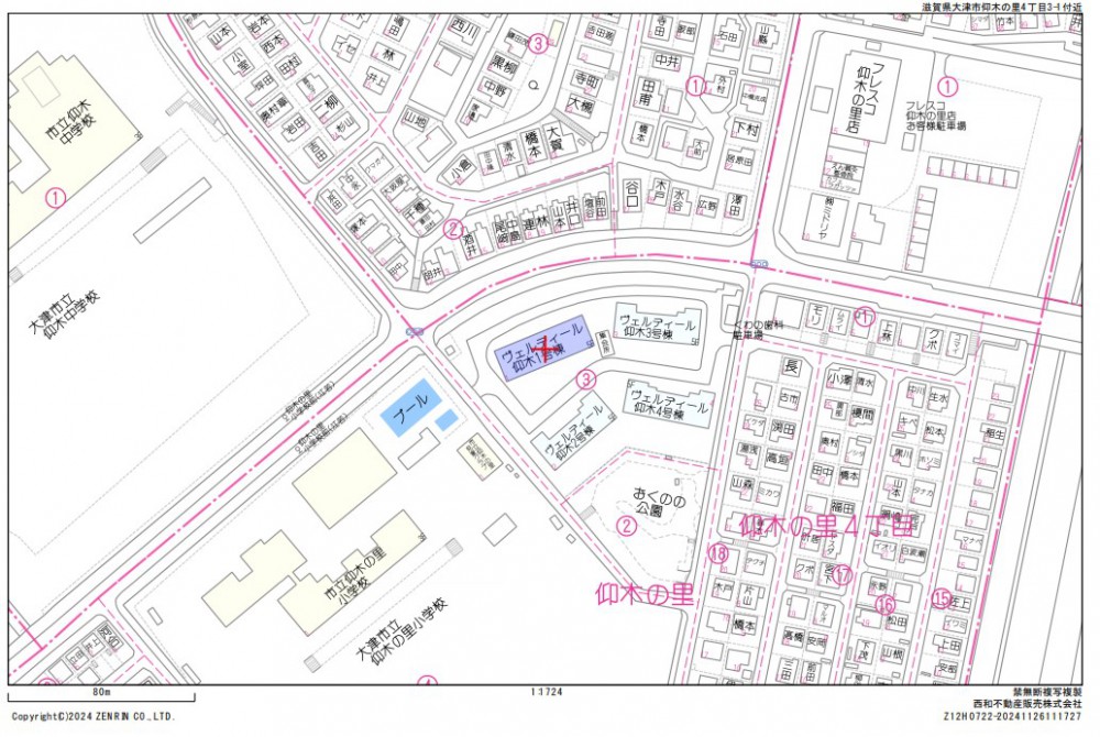 | 小学校区 | 仰木の里小学校 (距離: 360m) | 中学校区 | 仰木中学校 (距離: 490m) |