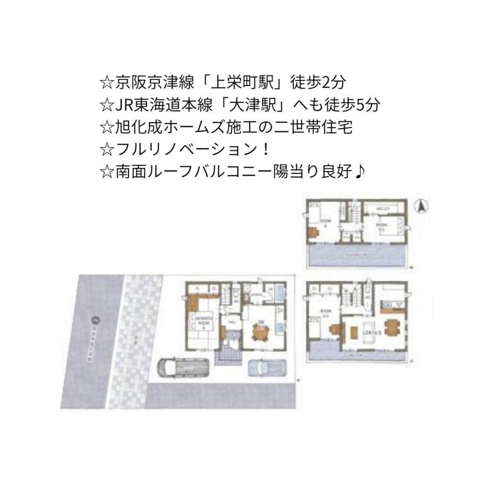 | セールスポイント | ☆京阪京津線「上栄町駅」徒歩2分 ☆JR東海道本線「大津駅」へも徒歩5分 ☆旭化成ホームズ施工の二世帯住宅 ☆フルリノベーション! ☆南面ルーフバルコニー陽当り良好♪ |