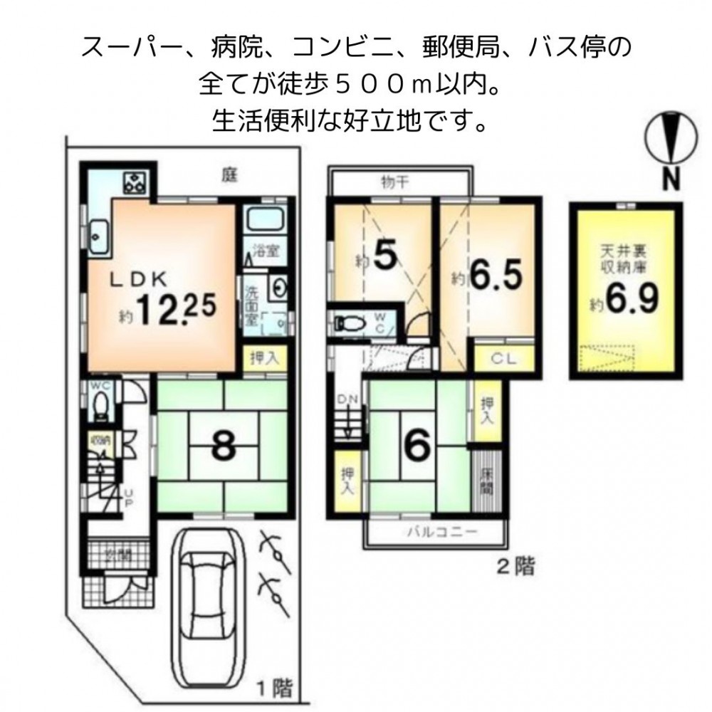 | セールスポイント | スーパー、病院、コンビニ、郵便局、バス停の全てが徒歩500m以内。 生活便利な好立地です。 |