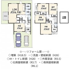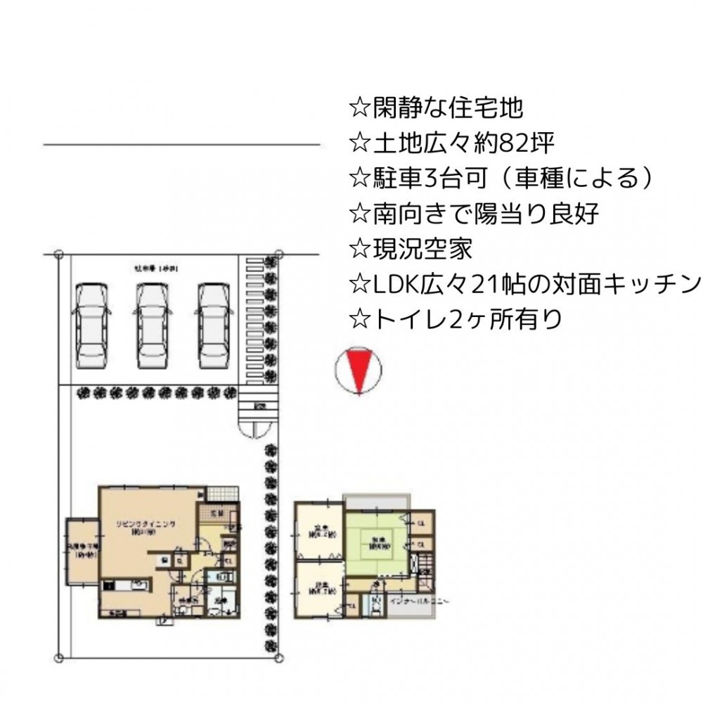 | セールスポイント | ☆閑静な住宅地 ☆土地広々約82坪 ☆駐車3台可(車種による) ☆南向きで陽当り良好 ☆現況空家 ☆LDK広々21帖の対面キッチン ☆トイレ2ヶ所有り |