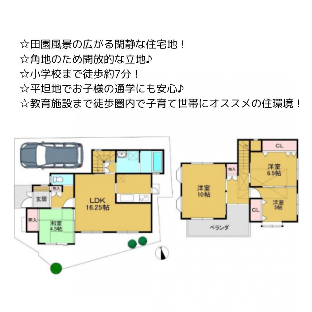 セールスポイント | ☆田園風景の広がる閑静な住宅地! ☆角地のため開放的な立地♪ ☆小学校まで徒歩約7分! ☆平坦地でお子様の通学にも安心♪ ☆教育施設まで徒歩圏内で子育て世帯にオススメの住環境! |
