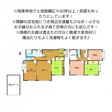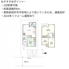 セールスポイント | ☆オール電化住宅! ☆JR東海道本線「長岡京」駅徒歩20分 ☆前面道路 公道:幅員約6.3m ☆両面バルコニー付き! ☆スーパー、コンビニ、ドラッグストアが近隣にあり周辺環境充実♪ |