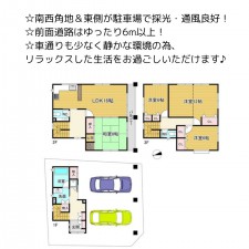 | セールスポイント | ☆開放感溢れる3LDKのお家♪ ☆全居室6帖以上で収納付き ☆小学校、公園、コンビニが徒歩圏内に有り◎ ☆前道が6mで駐車スペース広々! |