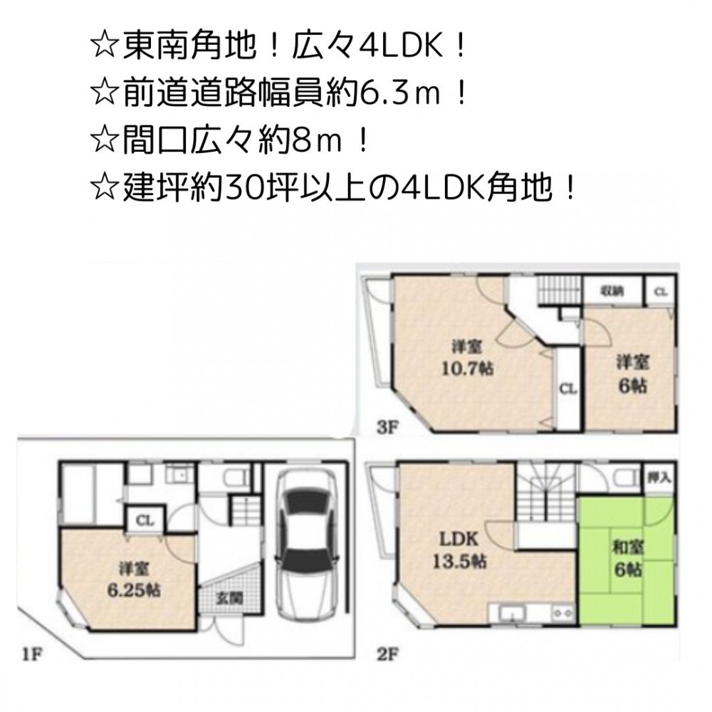 セールスポイント | ☆東南角地!広々4LDK! ☆前道道路幅員約6.3m! ☆間口広々約8m! ☆建坪約30坪以上の4LDK角地! |