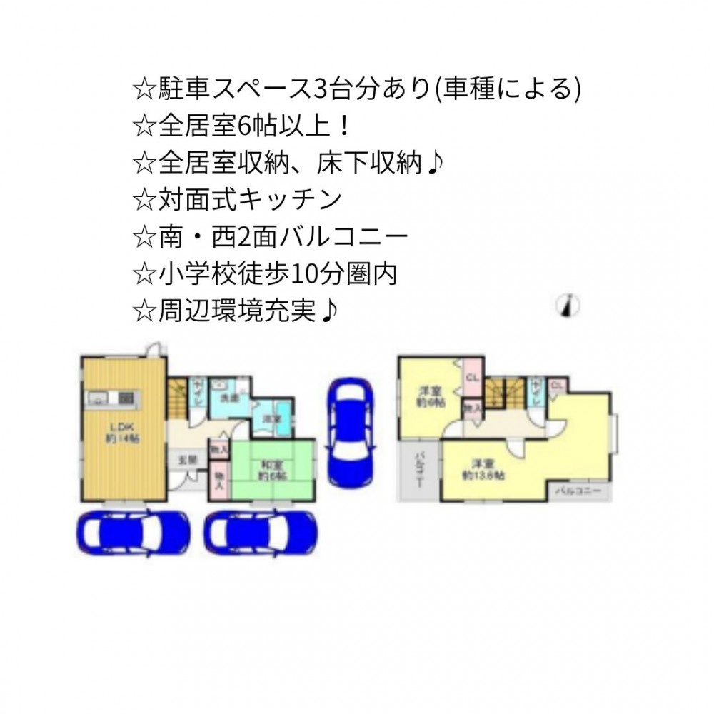 | セールスポイント | ☆駐車スペース3台分あり(車種による) ☆全居室6帖以上! ☆全居室収納、床下収納♪ ☆対面式キッチン ☆南・西2面バルコニー ☆小学校徒歩10分圏内 ☆周辺環境充実♪ |