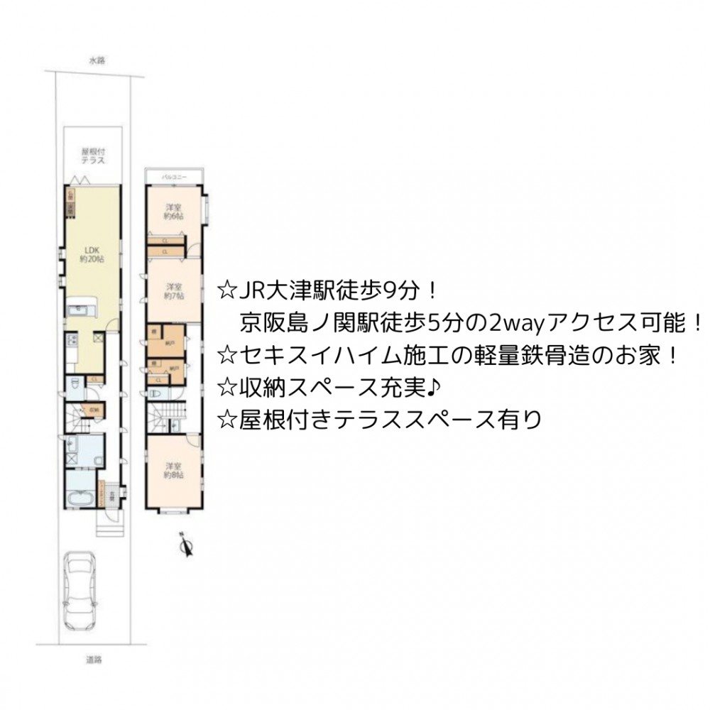 | セールスポイント | ☆JR大津駅徒歩9分!京阪島ノ関駅徒歩5分の2wayアクセス可能! ☆セキスイハイム施工の軽量鉄骨造のお家です! ☆収納スペース充実♪ ☆屋根付きテラススペース有り |