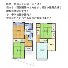 セールスポイント | 阪急「西山天王山駅」歩7分! 南向き・西側通路の2方空きで陽当り通風良好♪ 閑静な住宅街です! 小・中学校徒歩圏内♪ 空家に付きいつでも室内ご覧頂けます! |