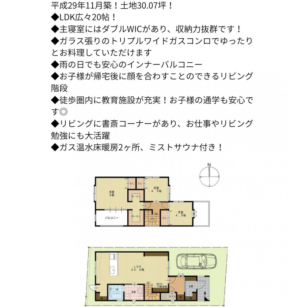 セールスポイント | 平成29年11月築!土地30.07坪! ◆LDK広々20帖! ◆主寝室にはダブルWICがあり、収納力抜群です! ◆ガラス張りのトリプルワイドガスコンロでゆったりとお料理していただけます ◆雨の日でも安心のインナーバルコニー ◆お子様が帰宅後に顔を合わすことのできるリビング階段 ◆徒歩圏内に教育施設が充実!お子様の通学も安心です◎ ◆リビングに書斎コーナーがあり、お仕事やリビング勉強にも大活躍 ◆ガス温水床暖房2ヶ所、ミストサウナ付き! |