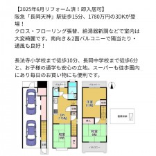 セールスポイント | 【2025年6月リフォーム済!即入居可】 阪急「長岡天神」駅徒歩15分、1780万円の3DKが登場! クロス・フローリング張替、給湯器新調などで室内は大変綺麗です。南向き&2面バルコニーで陽当たり・通風も良好! 長法寺小学校まで徒歩10分、長岡中学校まで徒歩6分と、お子様の通学も安心の立地。スーパーも徒歩圏内にあり毎日のお買い物にも便利です。 |