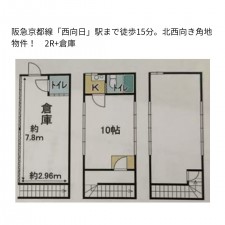 セールスポイント | 阪急京都線「西向日」駅まで徒歩15分。北西向き角地物件! 2R+倉庫。 |