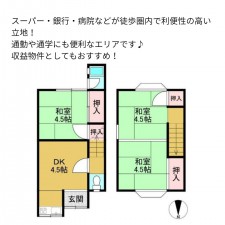 セールスポイント | スーパー・銀行・病院などが徒歩圏内で利便性の高い立地! 通勤や通学にも便利なエリアです♪ 収益物件としてもおすすめ! |