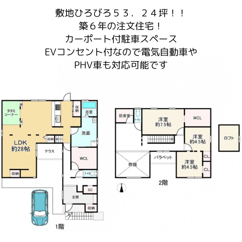 | セールスポイント | 敷地ひろびろ53.24坪!! 築6年の注文住宅! カーポートあり EVコンセント付なので電気自動車やPHV車も対応可能です |