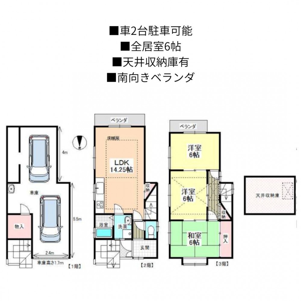 | セールスポイント | ■車2台駐車可能 ■全居室6帖 ■天井収納庫有 ■南向きベランダ |