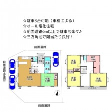 セールスポイント | ☆駐車3台可能(車種による) ☆オール電化住宅 ☆前面道路6m以上で駐車も楽々♪ ☆三方角地で陽当たり良好! |