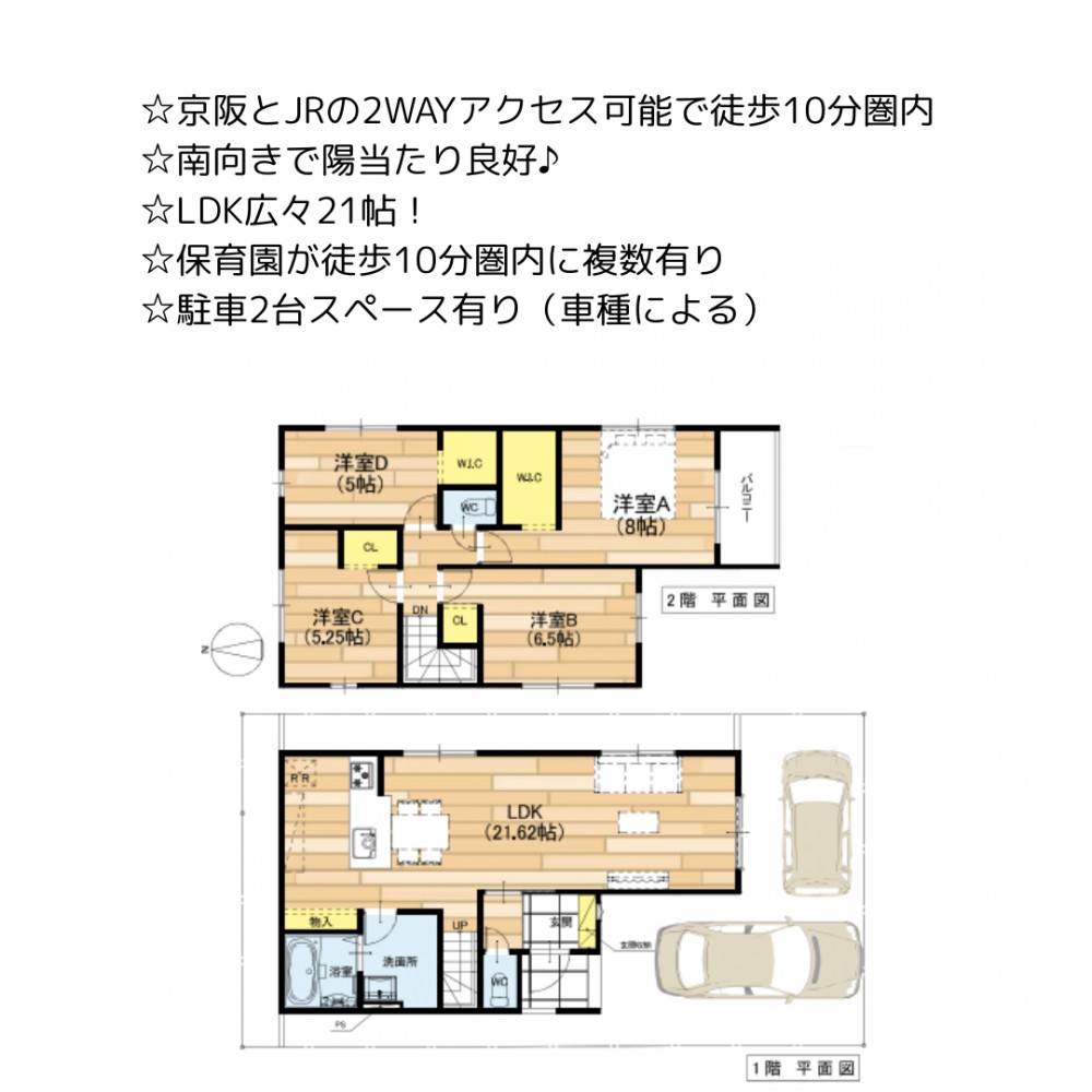 | セールスポイント | ☆京阪とJRの2WAYアクセス可能で徒歩10分圏内 ☆南向きで陽当たり良好♪ ☆LDK広々21帖! ☆保育園が徒歩10分圏内に複数有り ☆駐車2台スペース有り(車種による) |