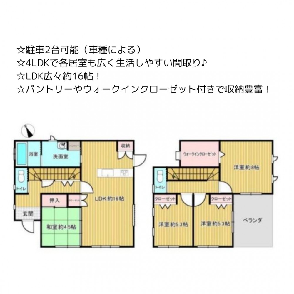 | セールスポイント | ☆駐車2台可能(車種による) ☆4LDKで各居室も広く⽣活しやすい間取り♪ ☆LDK広々約16帖! ☆パントリーやウォークインクローゼット付きで収納豊富! |