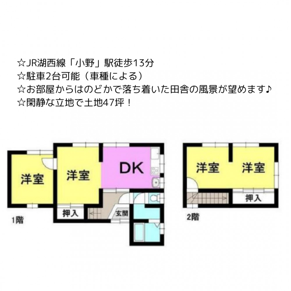 セールスポイント | ☆JR湖西線「小野」駅徒歩13分 ☆駐車2台可能(車種による) ☆お部屋からはのどかで落ち着いた田舎の風景が望めます♪ ☆閑静な立地で土地47坪 |